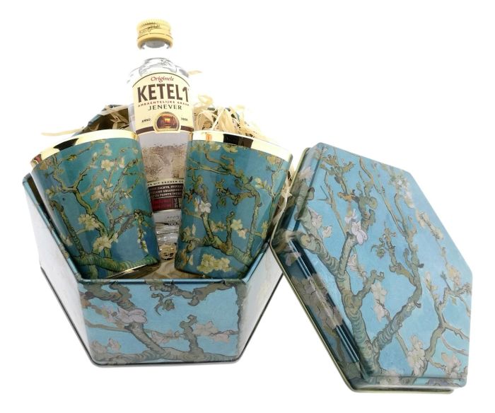 The tin contains a bottle of young gin and a matching set of shot glasses decorated with Almond Blossom.