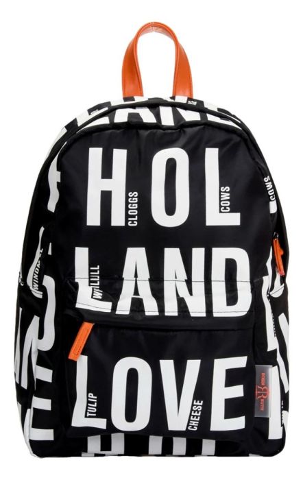 Sturdy Robin Ruth backpack in the colors Black and White with the theme "Holland". Decorated with the name "Holland" and the various famous souvenirs: Clogs, Tulips, Windmills
