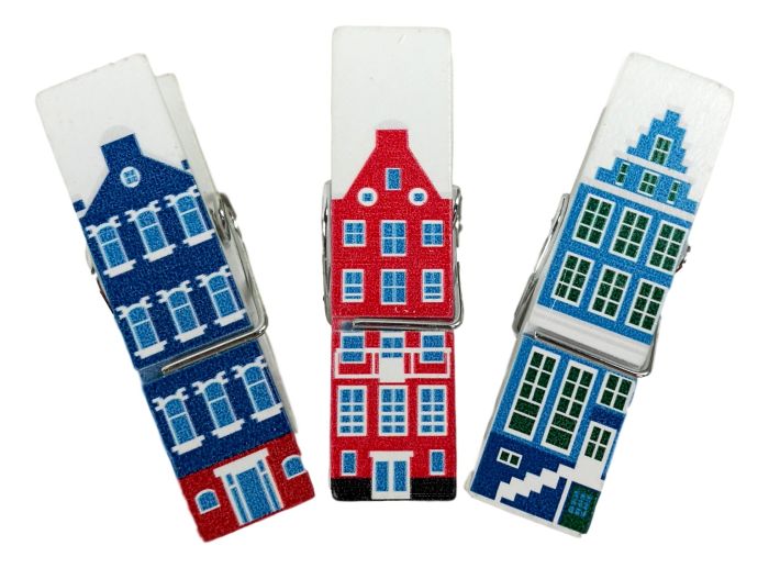 A bag with three colored Amsterdam Canal House pegs.