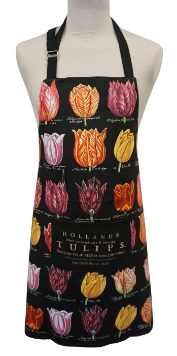 A sturdy, black-coloured apron decorated with Dutch tulips.