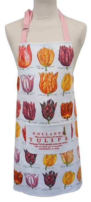 A sturdy, white-colored kitchen apron decorated with Dutch tulips. The type of tulip is listed under each tulip and on the pouch is a fact about the history of the tulip: