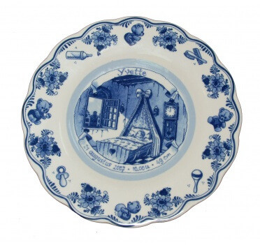 The Hollandwinkel offers a personalized Delft Blue birth plate that captures all the details of the birth and makes the perfect keepsake to put in the baby’s bedroom. It can be put on a small stand, or on the wall. The image on the birth plate shows an old Dutch children’s bedroom with a wooden baby bed and a grandfather clock.