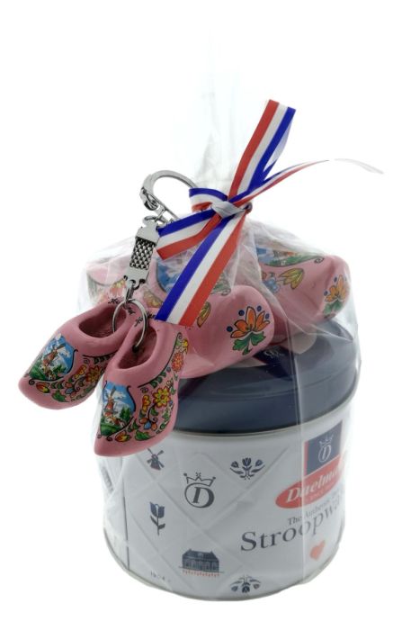 This cheerful tin with pink clog and matching key ring is from our rainbow series! Nicely decorated with a ribbon and a cellophane bag, these Delft blue cans are very suitable as a small gift to give away as a business gift at a conference or presentation.
