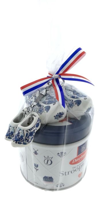 The Delft blue theme of the can already radiates Holland, but to make it even more pronounced we add a pair of sizable Delft blue clogs, a little delft blue clog keyring and wrap the can in a see-through cellophane bag and tie it all together with a red, white and blue ribbon on top.