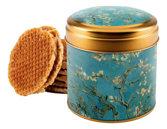 Beautifully decorated decorative syrup waffle tin decorated all around with the Almond Blossoms by Vincent van Gogh, a beautiful and delicious gift!