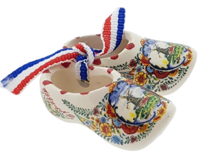 A cheerful colored set of Delft blue souvenir clogs. These small clogs are 5 cm each and made of ceramic. Tied together with the Dutch three colors, this is a nice gift for a new knowledge or relationship. On the wooden shoes a windmill is depicted, surrounded by floral motifs.