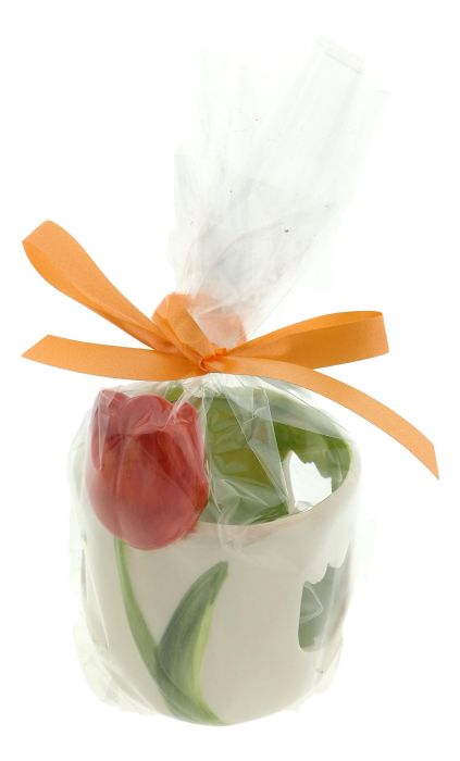 Nice ceramic waxine light holder decorated with an orange tulip and the text "Holland". A red colored tealight is included. This candle holder / waxine light holder (including tulip) is 9 cm high.