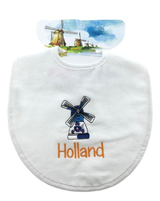 The bib has a beautiful design of a Dutch windmill in the middle, with the text "Holland" in bright orange above it.