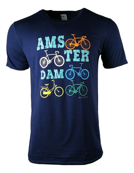 Donkerblauw t-shirt versierd met de tekst 'Amsterdam' en een vijftal gekleurde fietsen. Het t-shirt is gemaakt van 100% katoen.