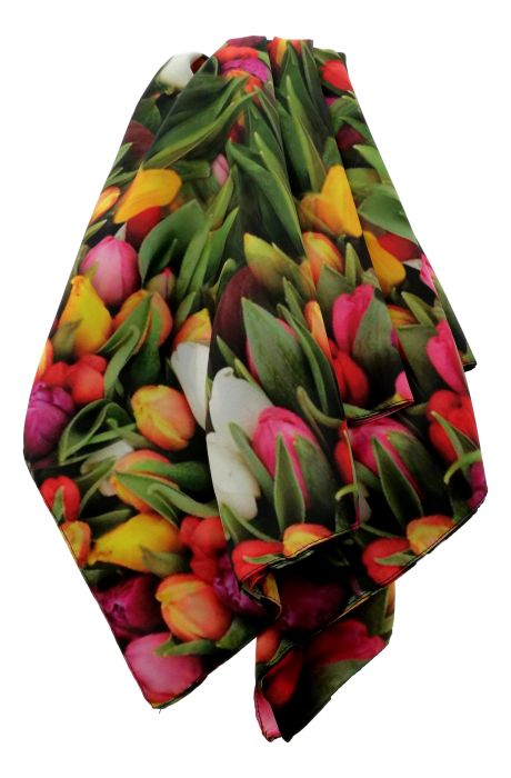 Beautiful shiny and soft scarf decorated with colored tulips.