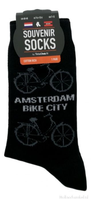 Black socks decorated with the text "Amsterdam Bike City" and typical Amsterdam bikes.