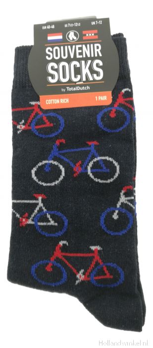 Dark socks that are decorated with Dutch bicycles in red / white / blue.