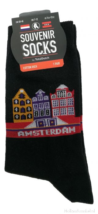 Black socks that are decorated with Amsterdam canal houses in yellow and red.