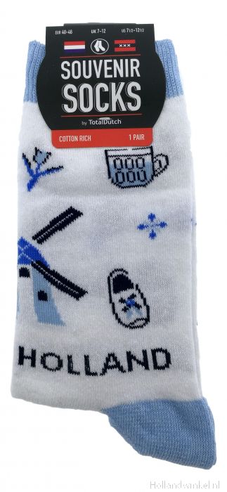 White socks that are decorated with various Dutch icons such as mills, wooden shoes and tulips.