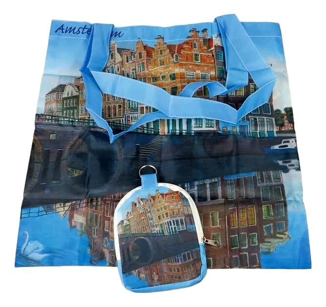 Handy reusable and foldable shopping bag in pouch. The bag is decorated with a picture of the Amsterdam prinsengracht. The bag is made of very light nylon, and folded it fits easily in a handbag. Quick to fold out and very handy when you need to store your groceries. The shopping bag measures 42 cm (wide) by 42 cm (high). The bag in which the bag is stored is 12 cm x 10 cm and has a zipper.