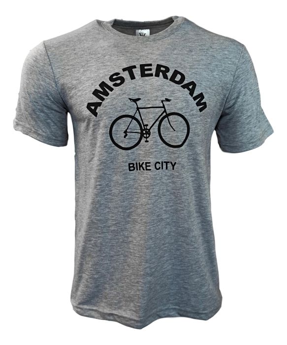 Gray t-shirt decorated with a large bicycle and the text "Amsterdam Bike City".