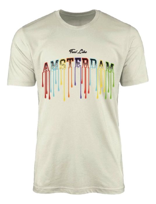The beige t-shirt features the words "Feel Like AMSTERDAM" in colorful, dripping paint letters that create a vibrant and dynamic design.
