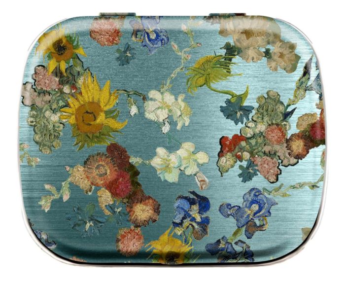 This small, compact tin is decorated with beautiful floral illustrations, inspired by the iconic paintings of Vincent Van Gogh.