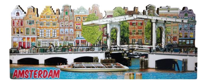 This two-layer refrigerator magnet shows a popular canal scene with an Amsterdam canal boat in front.
