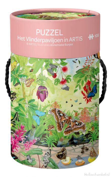 This nice jigsaw puzzle shows a beautiful illustration of the butterfly pavilion in Artis. Different types of butterflies, animals and plants are shown in the illustration.