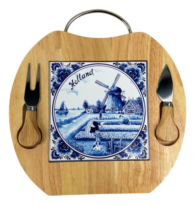Cheeseboard with delft blue tile and cheese cutlery set consisting of a cheese knife and a fork.