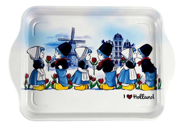 Small metal servingtray with 3 Dutch kissing couples in a Dutch tulipfield. The tray's size is 21x17cm. / 8.2x6.7 inch