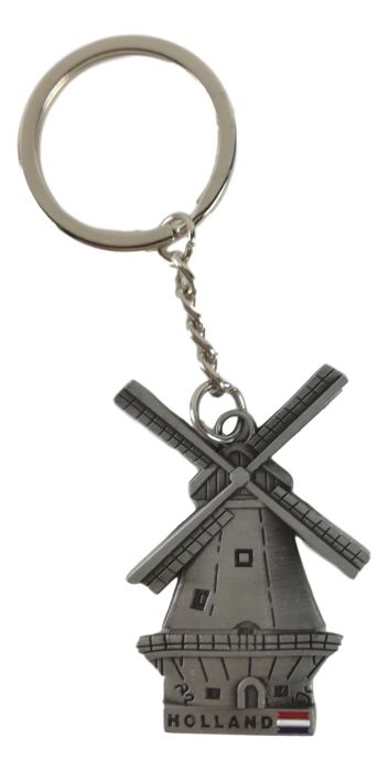 Tin colored metal keychain of a Dutch windmill. At the bottom, the mill is decorated with a Dutch flag and the text "Holland". The pendant is 5 cm tall and up to 4 wide.
