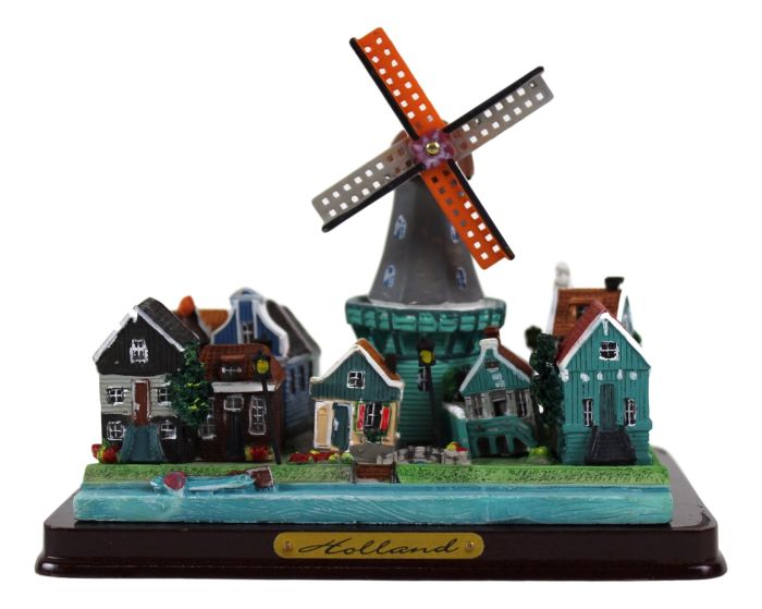 Beautiful brightly colored Dutch mill on top of a house in in a village made of Zaanse style houses. The mill stands on a luxury wooden bottom plate and is made of polystone. Polystone is a synthetic stone that makes the mill both solid and light. The dimensions of the mill are: 14 cm (wide) x 10 cm (deep) x 11 cm (high). The mill comes in a plastic gift box.