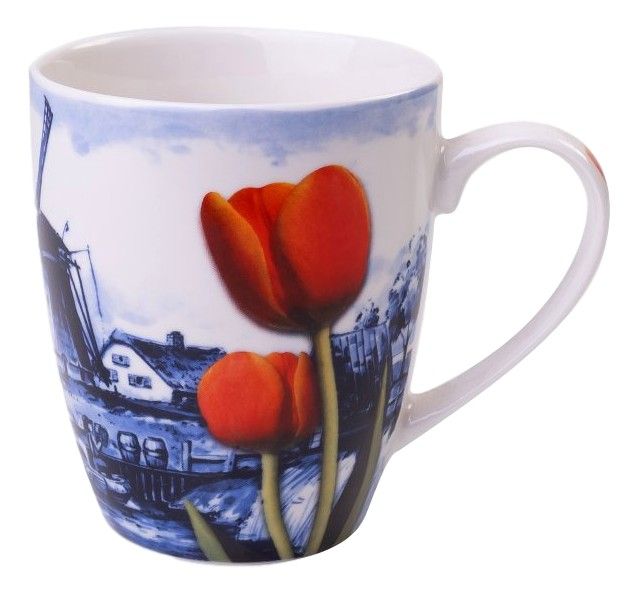 Beautiful mug decorated with a Dutch windmill landscape in Delft blue. Contrasting are the bright red with green tulips that are drawn in the foreground.