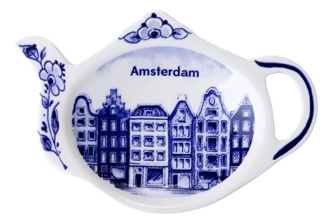 Delft blue tea bag holder of ceramic decorated with a white blue canal house motif. A tea bag holder is used to drip a tea bag after making a cup of the tea. This way the table stays dry, and the tea stays just right. The tea bag holder is 11 cm wide and 7 cm high.