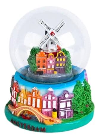 Cheerfully colored Amsterdam mill in a water ball on a foot with Amsterdam canal houses. The water ball has a height of 9 cm, and a diameter of 7 cm. The water globe is packed in a transparent plastic box. The water globe made of polystone, a resin / rock combination that makes it possible to achieve a high level of detail.