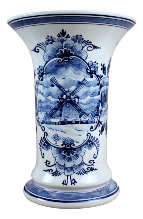 Beautiful hand-painted Delft blue vase with a wide opening at the top. The vase is decorated with a mill in a cartouche, and flowers at the back.