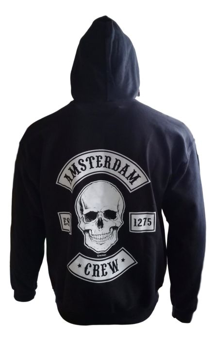 Black hoody with a large skull on the back and the text "Amsterdam Crew". Especially the skull on the back leaves a big impression. Made of 50% cotton and 50% polyester.