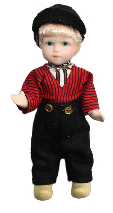 A charming Volendam porcelain doll, standing at 17 cm tall, dressed in a traditional costume and featuring black and red colors.