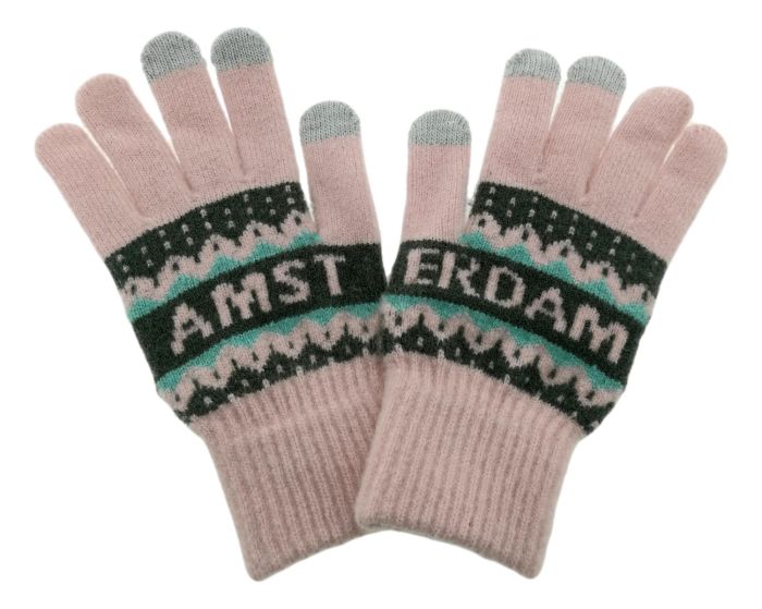 Cold fingers? These are nice and warm gloves with a colorful design. These pink finger ladies gloves are decorated with the text "Amsterdam".