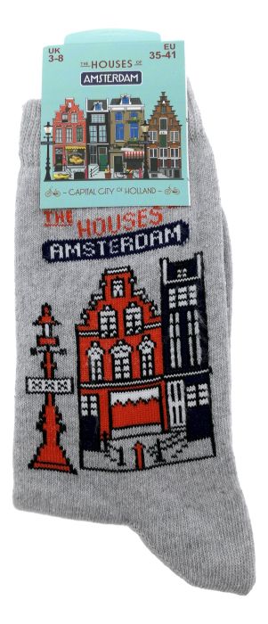 Gray socks decorated with Amsterdam canal houses and the text 'Houses of Amsterdam'.