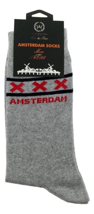 Light gray socks decorated with the three crosses of Amsterdam in red.
