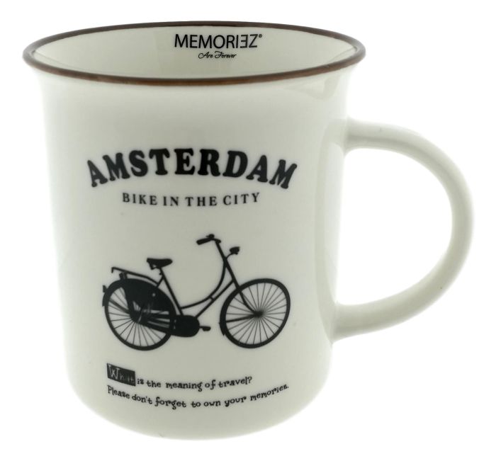 Mug made of ivory porcelain (new bone) in white color and decorated with a pen drawing of bicycles. There is an extensive text on the back.