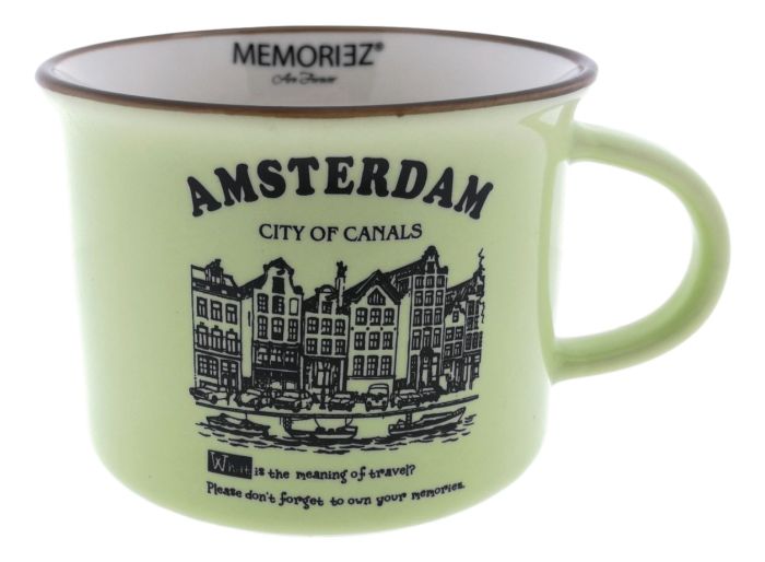 Small mug made of new bone porcelain decorated in green with a pen drawing of the Amsterdam canals. There is an extensive text on the back.