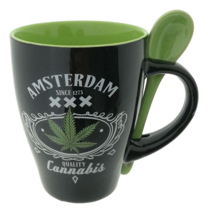 Large sturdy coffee mug decorated with the text "Amsterdam Quality Cannabis", for an after party where you need a sturdy cup of tea or coffee.
