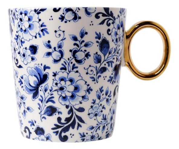 This beautiful porcelain mug is decorated with elegant Delft blue floral motifs that adorn the entire circumference. The refined gold handle provides a modern and stylish touch. This series of Delft blue mugs offers a variety of designs, which makes combining different mugs from the collection extra attractive.