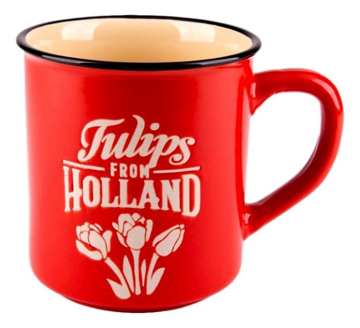 Nice big red coffee or tea mug decorated with the text 'Tulips from Holland' and a white tulip on a red background. The mug is delivered in a beautifully decorated brown cardboard gift box. The mug is 10 cm high and has a diameter of 9 cm. The box measures 12 cm x 10 cm x 10 cm.