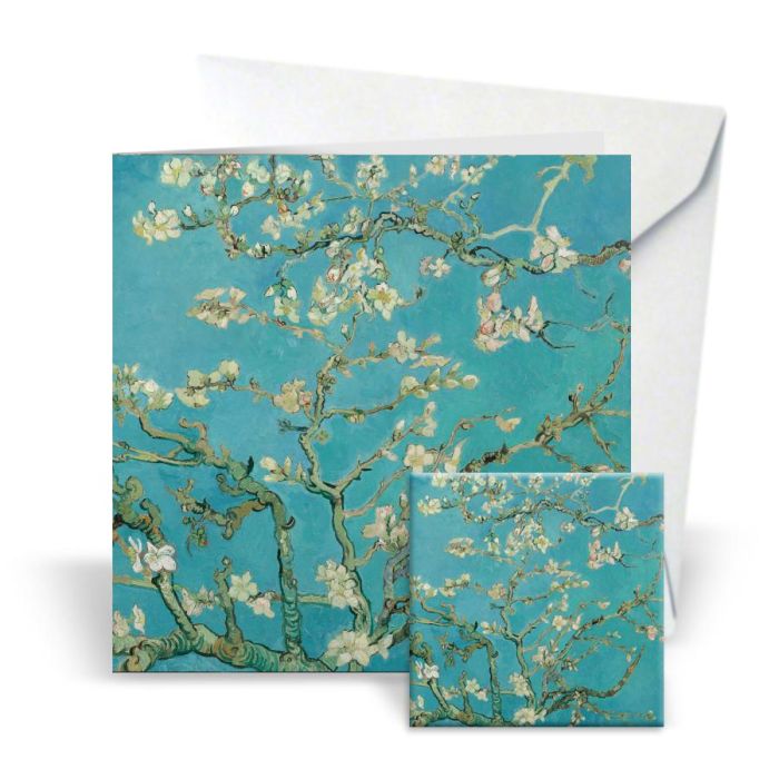 Small postcard with a picture of the work Almond Blossom by Vincent Van Gogh, the same image is also on the fridge magnet.