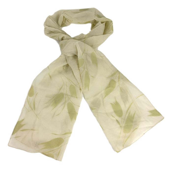 Translucent oblong light olive green ladies scarf decorated with tulips. The size of the scarf is 150 cm x 35 cm. Made in Italy from 100% polyester (artificial silk).