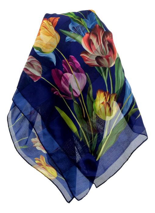 Beautiful shiny and soft navy blue colored scarf decorated with colored tulips.
