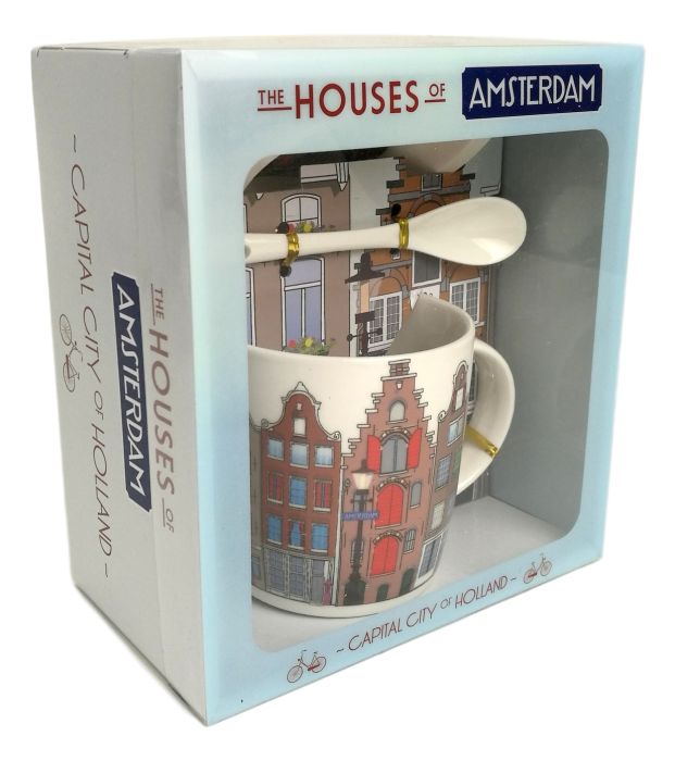 Nice big and sturdy gift box with transparent window. In the box there is a ceramic "Houses Of Amsterdam" mug with matching spoon and saucer.