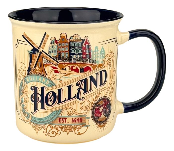 This ceramic mug features a vibrant design showcasing iconic Dutch symbols, including a windmill and traditional houses, with "Holland" and "Est. 1648" prominently displayed.