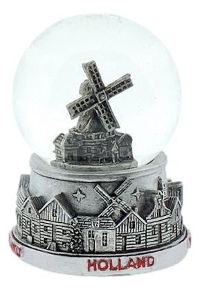 This water globe is a typical Dutch souvenir. The sphere is made of clear glass and has a metal mill in the middle. The mill is approximately 7 cm high and has a traditional Dutch style. The sphere is surrounded by a landscape with a house, a tree and a bridge. The landscape is made of snow and glitter. The text "Holland" is written on the edge of the sphere.