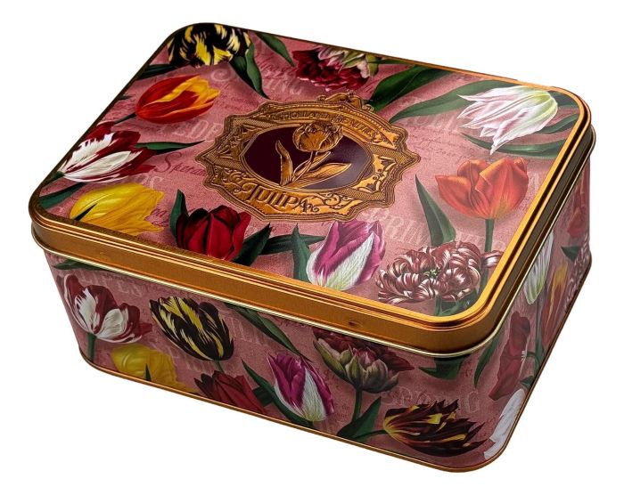 This beautiful gingerbread tin is filled with 380 grams of delicious, fresh gingerbread cookies. The tin is decorated with pink colored tulips.