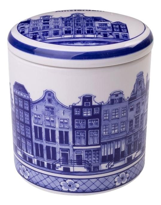 Beautiful ceramic storage jar that is decorated and at the top with a highly detailed drawing of Amsterdam canals.
